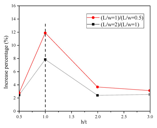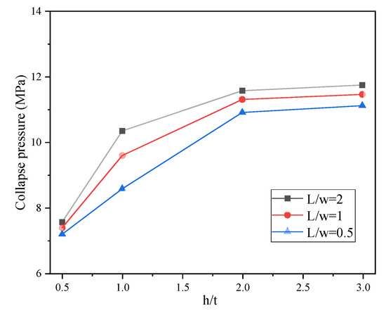 In this section, the effects of different sizes of CFRP are analysed. The adopted model is L/w = 0.5–2, h/t = 0.5–3. The thickness of the CFRP is 0.5–3 times the wall thickness of the steel pipe, and the length is 0.5–2 times the length of the defect. As shown in Figure 24, the collapse pressure of the repaired pipeline gradually increases as the thickness of the CFRP increases. Therefore, the greater the thickness, the better the effect of the repair. The repair efficiency has a nonlinear relationship with the length of the CFRP, as shown in Figure 25: when the length of the CFRP is the same as the pipeline defect, the repair efficiency is the highest. When the CFRP length is greater than the defect length, the repair effect decreases with the increase in thickness. When the CFRP thickness is the same as the pipe thickness, increasing the CFRP length can significantly improve the repair efficiency. Therefore, when the thickness of the CFRP is larger than the thickness of the steel pipe wall, the repair effect is not significantly improved.