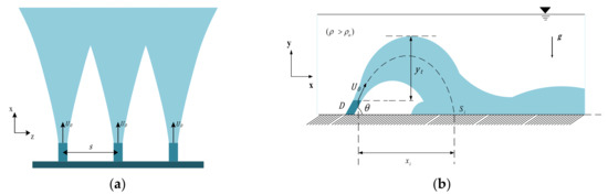 The mixing properties of the inclined dense jets are mainly characterized by discharge volume flux , kinematic momentum flux , and buoyancy flux , which can be defined by the following equations, respectively [28,45,58,59]: