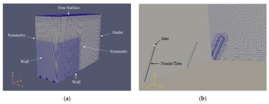 The three considered jets could reflect the mixing behavior of the jets in the whole system using appropriate boundary conditions. The simulations were conducted in a rectangular domain with the dimensions of 600 mm length (along x-direction), 400 mm depth (along y-direction), and 171 mm width (along z-direction); similar domains have been used in many hydraulic simulations [64,65,66]. The computational domain was surrounded by four types of planes, including wall, outlet, free surface, and symmetry planes. Furthermore, the nozzles were defined by two sections, including nozzle tube and inlet (Figure 2).
