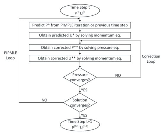 The governing equations were numerically solved using the finite volume method. The simulations were performed using an open source code OpenFOAM [70], and the solver twoLiquidMixingFoam was employed to perform the implementation in OpenFOAM. This solver is a transient solver for multiphase fluids and has been widely applied and validated in prior research [2,3,39,41,44,71]. The Gauss linear scheme was adopted for the discretization of the gradient and Laplacian terms, the Euler scheme was utilized to discretize the temporal terms, and the Gauss upwind, Gauss vanleer, and Gauss linear schemes were employed to discretize the divergence terms. The adopted algorithms to solve the coupled pressure and momentum equations were PIMPLE algorithms, see Figure 3. The preconditioned conjugate gradient (PCG) and preconditioned bio conjugate gradient (PBiCG) methods were employed for the pressure field and the other fields, respectively.
