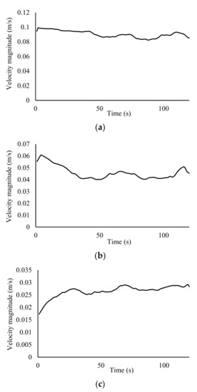 The Courant number, , can be defined as , where is flow velocity, represents time step, and indicates cell size. The time step was adjusted during the simulations, and the maximum courant number was set to be 0.5 to provide small time steps. The simulations were run for 120 s, and the results obtained by time-averaging over the period of 70 s to 120 s to ensure fully-developed flow and stable results. Figure 4 shows the time-series graphs for the velocity field along the trajectory of the central jet of case C2. To accelerate the simulation process, the numerical domain was decomposed into 16 regions, 4 parts in x- and 4 part in y-directions, and then each region was processed by a processor. Afterward, the entire domain was reconstructed and the results were extracted. All the computations were performed in the advanced research computing (ARC) systems of Compute Canada, and the real-time computing duration was ranged from 3 to 4 days.