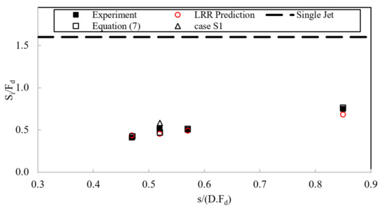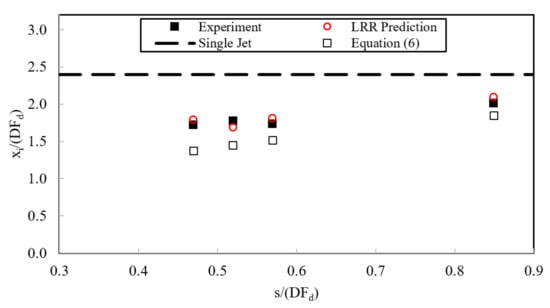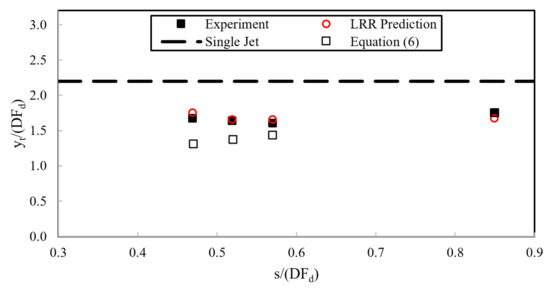 Figure 6 illustrates the results of normalized impact distance, , versus port spacing values. The model predictions of demonstrated a good match with the measurements as the prediction error based on MAPE was less than 4%. The values of increased with increasing values of port spacing, and all values were lower than the constant value presented for single discharges, = 2.4 [46]. Jet merging causes multiple inclined jets to bend inward, which results in lower impact distance compared to that of single discharges. However, single jets mix with the surrounding water without any intervention. As decreases, this effect is more pronounced, and the value of decreases. The LRR predictions showed higher values for impact distance compared to the general empirical equation for one- and two-sided multiple dense jets.