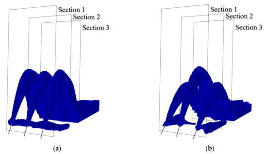 Visualization of (a) uniform (case C2) and (b) non-uniform (case S1) inclined dense jets, using a velocity isosurface (U = 0.015 m/s).