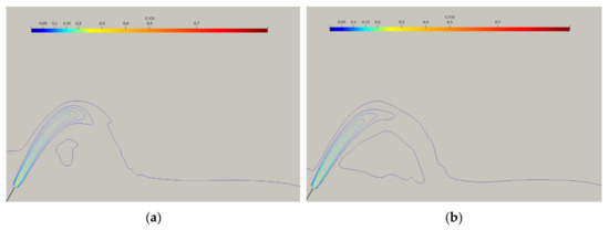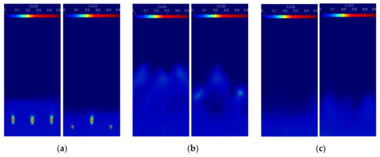 To investigate the jet merging process for the two different cases, concentration profiles at cross-sections close to and far from the nozzles were extracted, see Figure 9. Close to the ports, e.g., Figure 9a, the jets in both cases seemed to be completely separate, like single jets, with high concentration at the jet centers, and they were not wide enough to interact with each other. Along the trajectory, the jets became more diluted due to the entrainment of the surrounding water, due to shear induced entrainment at the jets’ edges. Farther away, e.g., Figure 9b, the maximum concentrations were significantly decreased compared to Figure 9a, and the jets were more diffused. The distance between the jet’s centers in case S1 are more than that of case C2 because of the difference between the jets’ elevation in case S1. Different orientations of the ports provide more space for the central jet to expand before interacting with other jets. As shown in Figure 9b, at x/(D.Fd) = 1.5, the jets in case C2 were almost merged, and there was no space between them or under the central jet. This means the entrainment of fresh water into the jet was restricted in the z-direction and y-direction, from the lower edge. However, there were still some areas with almost zero concentration around the central jet in case S1. It is worth mentioning that the entrainment was restricted in both cases and, therefore, dilution was less than that of single jets. Eventually, in case C2, the individual jets were indistinguishable after the impact point of the central jet, see Figure 9c. However, there was still a trace of 45° inclined dense jets in case S1.