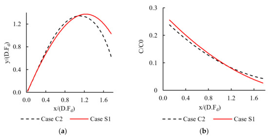 (a) Trajectory and (b) concentration of the central jet of cases C2 and S1.