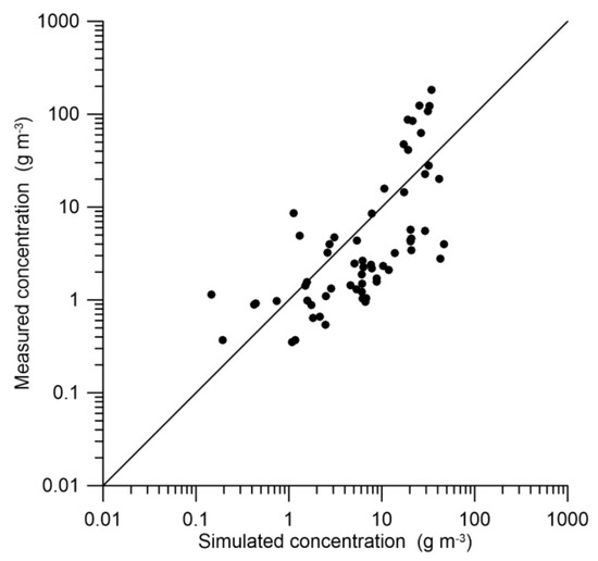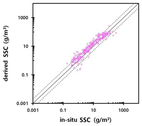 The simulation results of total suspended sediment concentration (SSC) were compared with in situ measurements and GOCI data. The results of the comparison of observed surface SSC measured in situ by [4] in coastal waters of Korea with simulation data are shown in Figure 8. The simulation and observations agree; however, RMSE = 27 mg L−1 was relatively large due to the complicated geometry and bathymetry of the region.