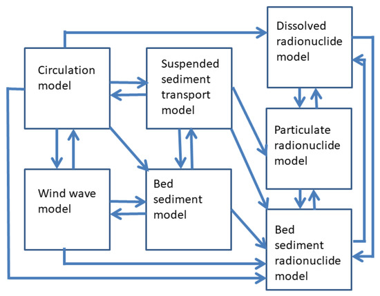 The sediment transport model is embedded into the wave–circulation model SELFE [14,15], recently transformed into the SCHISM model [16]. A 3D circulation hydrostatic SELFE model solves Reynolds-stress averaged Navier–Stokes equations using a finite element approach and unstructured grids. The governing equations describe conservation of mass, momentum, salt, and heat with hydrostatic and Boussinesq approximations. The equations of the third-generation spectral wave model WWM II are solved in the same finite elements simultaneously with circulation equations, resulting in an accurate description of the interaction between wind waves and currents by radiation stress mechanism and enhanced bottom friction [15]. Wind stresses, turbulent heat, and moisture fluxes at the surface of the ocean are calculated using a model for the surface layer of the atmosphere [17]. Data flow in the modeling system is given in Figure 2.