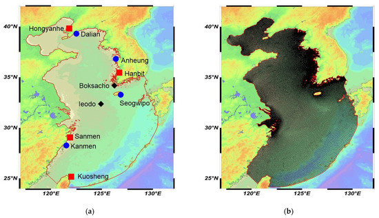 (a) Modeling domain with locations of tidal stations (blue circles), wave buoys (black diamonds), and NPPs (red squares). (b) Mesh for hydrodynamic simulations.