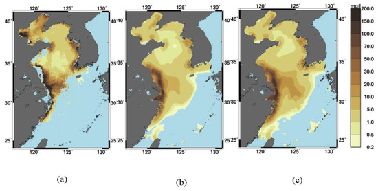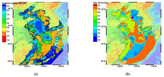 The seasonal variations of BYECS main river discharges (Fuchun Jiang, Chan Jiang, Huai He, Huang He, Haiho, and Han rivers) were taken into account [36]. The suspended sediment inflow was accounted for two rivers with the highest sediment load; Huang He and Chang Jiang loads were and t a−1, respectively. Mean suspended sediment concentration in the Huang He and Chan Jiang rivers was 25 kg m−3 and 0.5 kg m−3, respectively. The overall concentration was divided into several fractions: 0.1 kg m−3 of clay, 0.2 kg m−3 of fine silt, 0.1 kg m−3 of coarse silt, and 0.1 kg m−3 of fine sand for Chang Jiang River, and 3.75 kg m−3 of clay, 10 kg m−3 of fine silt, 7.5 kg m−3 of coarse silt, and 3.75 kg m−3 of fine sand for Huang He River.