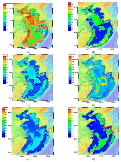 The distributions of five sediment fractions reconstructed in this way are shown in Figure 5b–e. As seen in Figure 5, deposits of clay and fine silt dominate the Bohai Sea, a patch in the center, along the western coast of the Yellow Sea, and in the deep Okinawa Trough. The fine and coarse sand make up about half of the fractional composition at the edge of the shelf of the East China Sea and the western coast of Korea.