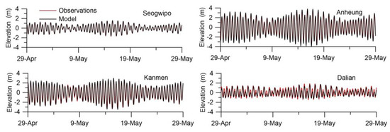 The comparison of the time series of observed tide elevations (red lines) in May 2011 with model-computed elevations (black line) in four locations (Seogwipo, Anheung, Kanmen, Dalian), which are shown in Figure 3.