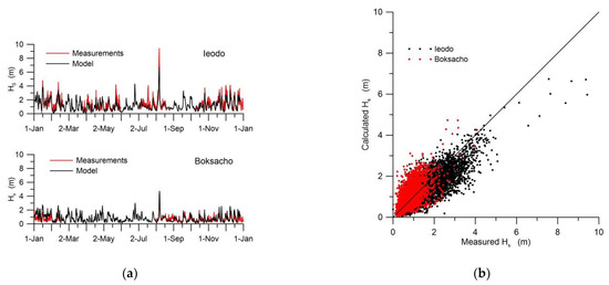 (a) The comparison of the time series of observed significant wave heights in 2011 with computed values in two locations of KHOA buoys [37] as shown in Figure 3; (b) measured vs. calculated for two locations of KHOA buoys in 2011.