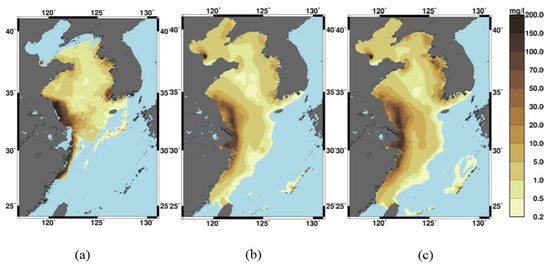 Surface distribution of SSC from (a) GOCI remote sensing data; (b) simulation without waves; (c) simulation with waves for 4 October 2013.