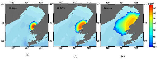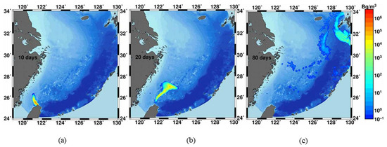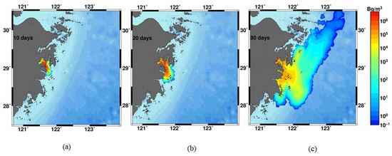 The surface distributions of 137Cs concentration after 10 days, 20 days, and 80 days after beginning of release from Sanmen NPP are shown in Figure 11. As seen in the figure, the plume of contaminated water changes path with time from southeast to northeast, being entrained by the coastal current. The total amount of dissolved 137Cs in Figure 12a initially decreased and then stabilized or slightly grew when resuspension was taken into account. The total amount of 137Cs adsorbed on suspended sediments after release decreased both with and without resuspension (Figure 12b). The total amount of bottom contamination of 137Cs first increased, then stabilized or slightly decreased when resuspension was taken into account (Figure 12c). This case study shows the importance of exchange between dissolved, suspended, and bottom components of 137Cs contamination. The total amount of bottom contamination of 137Cs was about 40% of the dissolved component and the total amount of suspended component was about 20% of the dissolved component, which contrasted with the Fukushima Daiichi accident where the particulate component was only 2% [11]. The resuspension effect changed the amount of 137Cs by about 10%.