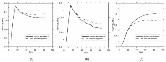 The total amount of 137Cs adsorbed on suspended sediments and bottom contamination reaches a maximum and then decreases, both with and without resuspension (Figure 14b,c). The resuspension plays a minor role compared with the Sanmen location. Similarly to the Sanmen case, the total amount of bottom contamination of 137Cs was about 40% of the dissolved component and the total amount of suspended component was about 20% of the dissolved component. This case study confirms the importance of exchange between dissolved, suspended, and bottom components of 137Cs contamination.