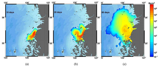 The surface concentration of 137Cs after 10 days (a), 20 days (b), and 80 days (c) release from the Hanbit NPP.