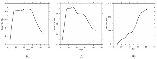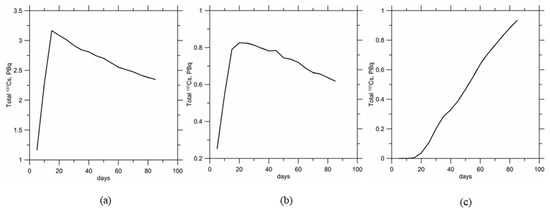 (a) Total amount of dissolved 137Cs after release from the Sanmen NPP; (b) total amount of 137Cs adsorbed on suspended sediments after release from the Sanmen NPP; (c) total amount of bottom contamination of 137Cs after beginning of release from the Sanmen NPP.