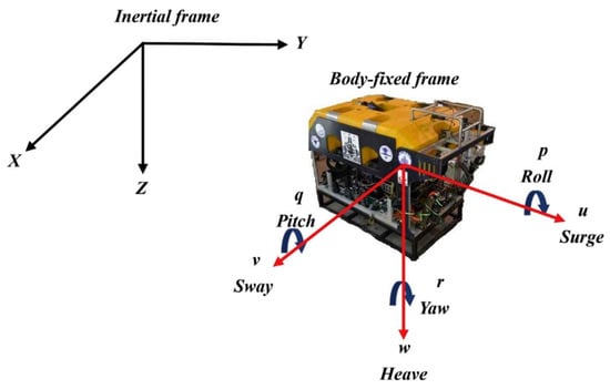 The HaiMa ROV shown in Figure 1 is a typical work-class ROV. In general, two coordinate frames, namely, the inertial frame and the body-fixed frame, are usually defined to describe the motion of ROVs. The two coordinate systems are transformed by the Jacobian transformation matrix :
