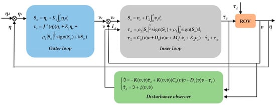 In this section, a double-loop control strategy, which is often used in the control of underwater vehicles [,,,,], is utilized to decompose ROV motion into an inner loop (velocity loop) and an outer loop (position and attitude loop). Controllers are designed separately for the inner and outer loops. The outer-loop controller is combined with a novel reaching law to ensure the fast convergence of the sliding-mode surface while providing the reference velocity to the inner loop. An ST second-order sliding-mode scheme is employed to design the inner-loop controller because of its special ability to remain robust with less chattering []. External disturbances and internal uncertainties are estimated and eliminated by the designed nonlinear disturbance observer so that the tracking accuracy and system robustness can be enhanced while the chattering is further reduced. The control strategy diagram is shown in Figure 2.