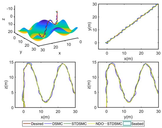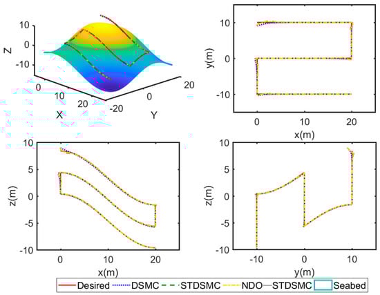 In this mode, the efficacy and advantages of the proposed controller are tested by tracking a desired trajectory given in [], which contains common operating conditions for ROV operations, such as a fixed depth, fixed height, and fixed yaw angle. The lumped environmental and cable disturbances made up of sine functions are considered as follows: