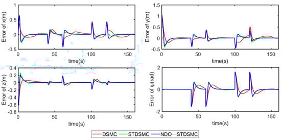 As shown in this table, the tracking errors of the STDSMC and NDO-STDSMC methods are significantly smaller than those of the DSMC method. Additionally, except that the average value of the tracking error in the x direction of the NDO-STDSMC method is slightly larger than that of the STDSMC method, the errors in the other directions are smaller. This shows that the introduction of the DO enhances the robustness and stability of the controller. Figure 6 shows that the observer can estimate the lumped disturbance force very accurately in this scenario.