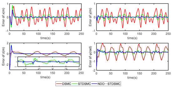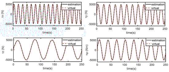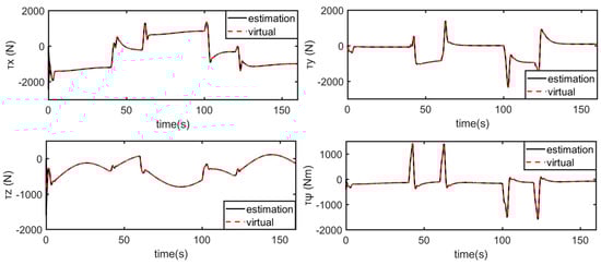 The advantages of NDO-STDSMC are due to the utilization of the NDO because the strong external disturbances are accurately estimated by the observer. Different from the passive antidisturbance methods of DSMC and STDSMC, the introduction of the NDO is a feedforward compensation for the control system, which is an active antidisturbance strategy. Figure 11 shows the actual disturbances and their estimates in each direction of the ROV motion. It is clear that the estimates of the NDO are very accurate. The observer compensates for the influence of external interference on the ROV motion, so the control system can achieve more robustness, thereby ensuring more accurate trajectory tracking. This again illustrates that when large disturbances exist, using a DO is an effective way to improve the robustness of the controller.
