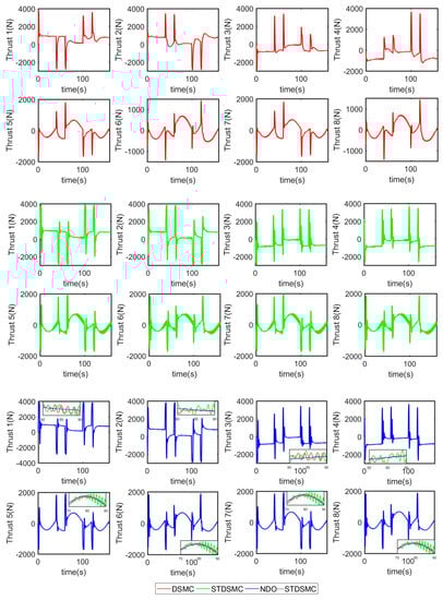 Figure 7 shows the output of the eight thrusters of the three controllers. It can be seen from the figure that at the time when the target path changes, such as 40, 60, 100, and 120 s, there is unavoidable chattering in all three methods. During the period when the path is stable, such as 70 to 90 s, the NDO-STDSMC method exhibits almost no chattering, while the DSMC and STDSMC methods exhibit more obvious chattering. This shows that the proposed controller can significantly suppress the output chattering while ensuring stability and robustness, which is more suitable for practical applications.