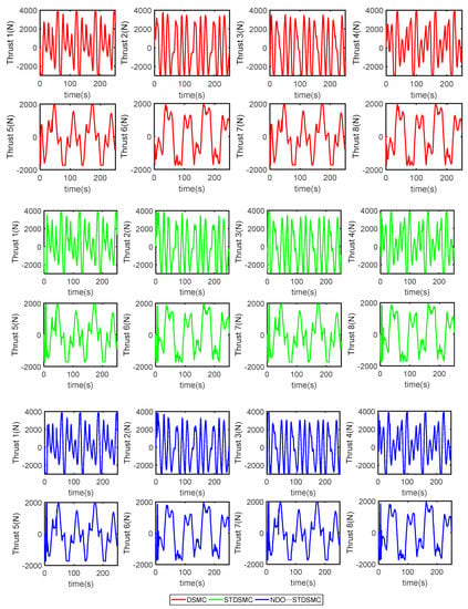 Figure 10 depicts the thrust forces of the ROV’s eight thrusters under the three controllers. This figure shows that the chattering is almost the same for the three controllers, chattering inevitably occurs at the nonsmooth trajectory transition instants, and there is almost no chattering in other consecutive stages. This shows that the NDO-STDSMC method does not improve the control accuracy and robustness at the cost of increasing the chattering. Due to the large external disturbances, some thrusters have short-term output saturation, which is often encountered in the actual operation of ROVs in large depth.
