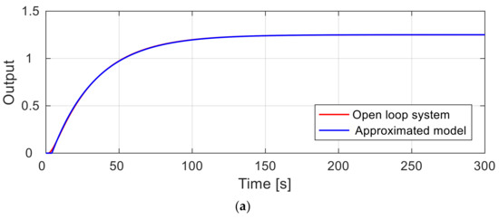 The FOPTD model of the regasification system is obtained as K = 1.2508, L = 4.1, and T = 30.578 through several iterations in the identification toolbox of MATLAB using unit steps as input and glycol temperature as output. At this time, the sampling time is 0.01 s. The outputs and error when the unit step input is introduced to the original regasification open-loop system and the approximated FOPTD model are shown in Figure 5. The approximated model closely matches the original system.