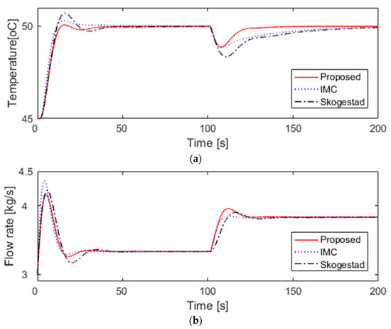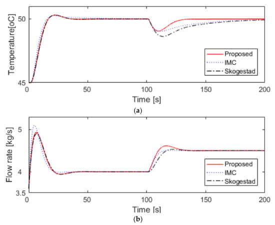 The simulation process is subject to the same conditions as the nominal heat exchanger, except for changes in the parameters of the heat exchanger. The robustness is evaluated by simultaneously inserting 20% perturbations into each of the nominal parameters of heat exchanger towards the worst case parameter mismatch and assuming the actual process to be . Performance measurements for quantitative comparison are tabulated in Table 4. As shown in Figure 7 and Table 4, all three methods in the set-point tracking responses show similar responses that converge to the desired value without steady-state errors, but Skogestad’s method has a slightly longer settling time and larger percentage overshoot compared to the other two methods. On the other hand, the IMC method and the Skogestad’s method show a very long recovery time and a very large IAE in the disturbance rejection response. In particular, Skogestad’s method has a very large maximum peak error. However, the proposed method has a very short recovery time and a very small IAE compared to the other two methods. The proposed method reduced IAE by about 42–57% compared to the other two methods in the disturbance rejection response. The IAE value in the disturbance rejection response is smaller in the order of the proposed method, IMC method, and Skogestad’s method. Therefore, even if there is parameter uncertainty, the suggested method in the disturbance rejection response is the best and Skogestad’s method is the worst.