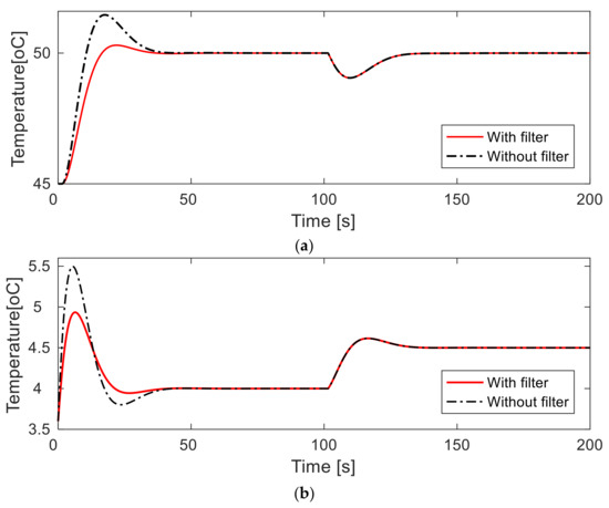 A set-point filter is used to reduce the overshoot in the set-point tracking response. The same controller that was previously designed is still used for the simulation. If a filter weighting value of b = 0.96 is used, the set-point filter, and if b = 1.0, the gain of the set-point filter will be 1, so the filter is not used. Figure 8 shows the closed-loop response by the proposed method for both with and without the set-point filter, and the performance indices such as tr, ts, OS(%), Mpeak, trcy, and IAE are listed in Table 5. When a set-point filter is used, the IAE value is reduced from 53.364 to 46.682, OS (%) from 2.926 to 0.602, and settling time from 35.475 to 30.694. As expected, using the set-point filter can improve the performance of the set-point tracking response, and Table 5 confirms that the set-point filter does not affect disturbance rejection performance at all.