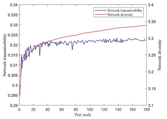 Then, a Pearson correlation analysis was conducted. The correlation coefficients between the network transmissibility when a port fails and the degree value and weighted degree value of a failed port node were −0.864 and −0.770. The correlation coefficients between network diversity when a port fails and degree value and weighted degree value of failed ports were −0.932 and −0.796, and the significance levels were all less than 0.01. The results show that the larger the degree value and the weighted degree value of a port node, the greater the influence on the network transmissibility and diversity when a port node fails. From the perspective of structural position, the degree values of dominant ports are large. Additionally, they are transfer stations for multiple ports, which means efficient connectivity and diversified connections can be realized. From the perspective of connection strength, these ports are not only connected with many ports but are also closely connected, and the flow of goods is also frequent.