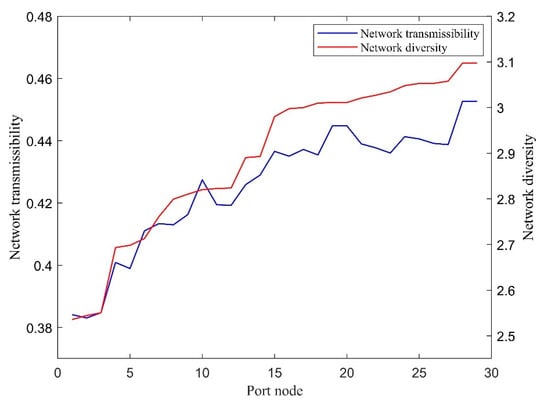 Firstly, the network transmissibility and diversity of the MSR shipping network in the initial state without interference were calculated, which were 0.3256 and 3.3488, respectively. Then, the adjacency matrix of the MSR shipping network under different port failure scenarios was simulated, and the resilience of the network structure was measured. Figure 2 shows the network transmissibility and diversity changes when all port nodes fail individually in sequence. The simulation found that when an emergency occurs, the path length and the number of alternative paths between ports will be affected. Additionally, the cost related to the connections between ports will increase, and the number of alternative paths will decrease, which will lead to the simultaneous attenuation of the resistance, response and resilience of the network structure. Some ports greatly impact the transmissibility and diversity of a network, meaning that they have important roles alongside their roles as bridges. Additionally, some ports are also important for path diversification.