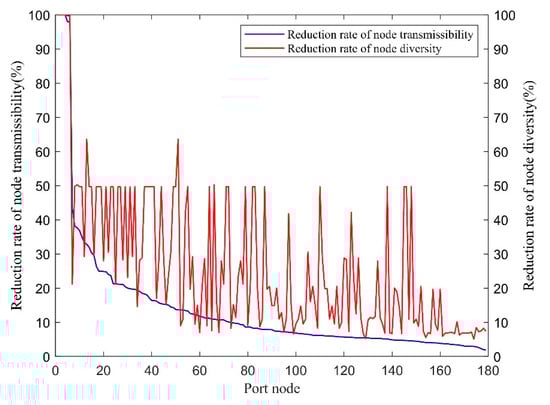 It can be found that the reduction degrees of port node transmissibility and diversity under the maximum disturbance state are different. The transmissibility and diversity of the Abidjan, Vigo, General Santos and Yangon ports under the maximum disturbance state both drop to 0, which is because these four ports are only connected to one port in the MSR shipping network. When their connected port fails, the four ports will be isolated. Some ports, such as Singapore port, Port Klang and Colombo port, show strong resistance to intervention.