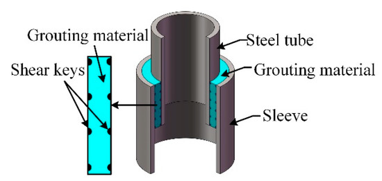 A concrete-filled steel tube (CFST) column is an economical and reasonable structure [1]. It contributes to the improvement of construction efficiency and the realization of industrial production. Sleeve grouting connections were used to connect column to column. The sleeve grouting connections are also the key component of the support structure for offshore wind turbines. For the offshore wind turbine foundation with water depth ranging from 10 to 60 m, sleeve grouting connection was needed to connect the wind turbine foundation with the transition section [2]. Liu et al. [3,4] studied the axial compression performance of prefabricated core steel tube reinforced concrete columns, and compared with the integral pouring column, the ultimate bearing capacity and deformation capacity were all improved. Chen et al. [5,6] proposed a new prefabricated type of sleeve grouting connection method and applied it to composite shear walls, special-shaped columns, and other structures, showing good connection performance and seismic performance. Figure 1 shows the sleeve grouting connection of the CFST column. Shear keys were arranged on the outer wall of the steel tube and the inner wall of the sleeve in the connection. To increase the mechanical interaction load between the grouting material and steel tube, the connection performance of the sleeve grouting connection is improved.