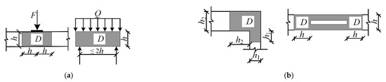 According to the strut-and-tie model [7] and the experimental performance of the sleeve grouting connection [8], when the grouting material was destroyed along the shear keys in the connection, its strain field changed. The internal load of the connection was redistributed, and a conical section was formed. This is the region of stress and strain discontinuity, and the internal load of the region was determined by the strut-and-tie model. The discontinuous region of the strut-and-tie model was regarded as the D region [9,10], and its strain was nonlinear. D region is shown in the shaded part of Figure 2, where F is the concentrated load and Q is the distributed load [11].
