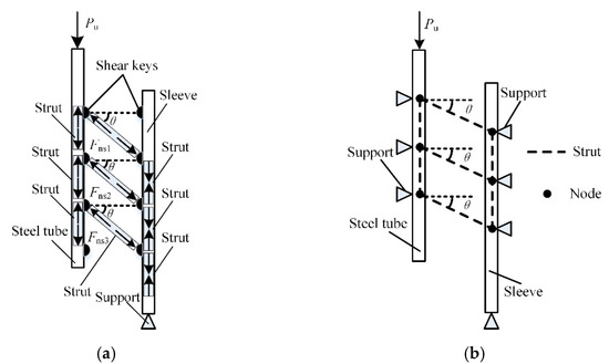 Figure 3 shows the strut-and-tie model of the sleeve grouting connection for a CFST column. The steel tube was subjected to the axial load Pu. When the grouting material was damaged, oblique cracks beginning with shear keys appeared [35,36]. The crack angle θ was approximately 45°. Oblique cracks divided the grouting material into several closed annular sectors to transfer loads. Consider these annular sectors as struts to transfer loads. Since the cross-sectional area of the strut is the smallest at the position of contact with the steel tube, the compression failure of this section is considered the standard of the axial compression capacity of the strut.