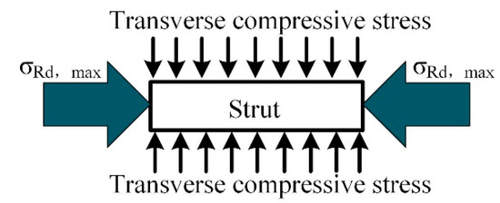 In the sleeve grouting connection of the CFST column, since the grout is located between the steel tube and the sleeve, it is in a state of trip-direction compression, which conforms to the characteristics of the transverse compressive stress of the strut in the EC2 code. Figure 5 shows that the strut of concrete is subjected to both axial and transverse compressive stresses. σRd,max is the axial stress of the concrete strut.