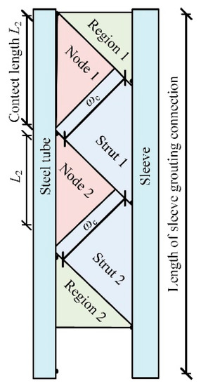 Figure 9 shows the distribution method of the struts under a staggered arrangement of shear keys. Since there were three oblique cracks in the grouting material in the specimen [35], it can be considered that the four shear keys divide the grouting material into three struts. Strut 1 and Strut 2 are regarded as full-size struts. Region 1 and Region 2 are regarded as the third strut of the connection, and the three struts are considered to have the same size and loading characteristics. If the total length of contact between the three struts and steel tube is set as 2.5 times the shear key distance, then the contact length between each node and steel tube is shown in Equation (17).