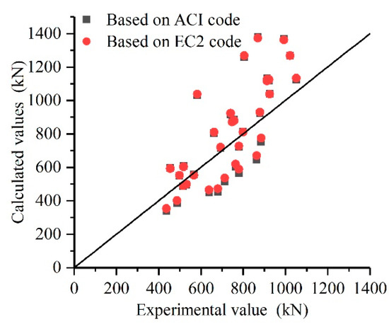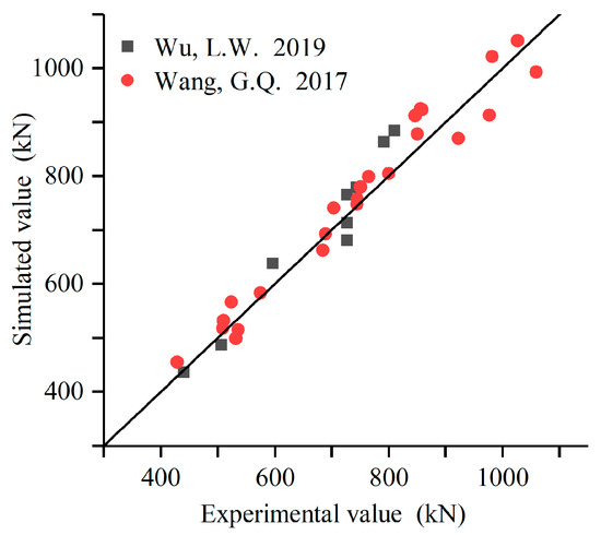 In Figure 13, finite element models were established for 33 specimens in references [8,37]. The scatter figure is drawn by comparing the experimental values with the simulated values. The 45-degree oblique line was drawn in the figure. The simulated values are close to the experimental values, which further verifies the correctness of the model and lays a foundation for subsequent parameter expansion analysis. The average ratio of simulated value to experimental value in references [8,37] was 0.98 and 0.99, respectively.