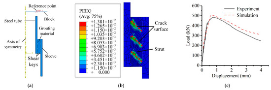 Table 1 shows the basic parameter information of the specimen in references [8,37], where is the grouting connection length, s is the distance between two adjacent shear keys, h is the shear key height, and Pu is the axial compression capacity of the sleeve grouting connection.