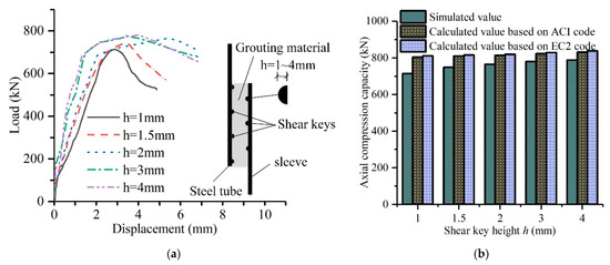 Steel tubes transfer loads to grouting materials through shear keys, and the size of shear keys will affect the strength of the sleeve grouting connection [41]. Figure 14 shows load–displacement curves of the sleeve grouting connection at different heights of shear keys. Theoretical calculations were made for models with different shear key heights based on the ACI and EC2 codes, and the calculated values were compared with the simulated values. The shear key height h in specimen B3 is set as 1 mm, 1.5 mm, 2 mm, 3 mm and 4 mm.