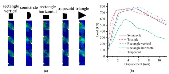 Different shear key shapes: (a) grouting strain of different shear key shapes; (b) comparison of load–displacement curves of different shear key shapes.