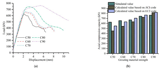 As shown in Figure 16b, the calculated values of different grouting material strength models based on the ACI code and EC2 code were determined. Compared with the simulated values, all of the calculated values based on the ACI code were less than those based on the EC2 code and 9.6% smaller on average. The simulated values were 12.3% larger on average than those based on the ACI code. The simulated value is 0.66% larger than the calculated value of the European code. Compared with the calculated values in the EC2 code, the simulated values and the calculated values are relatively stable, which verifies the applicability of the simulation results and the calculated results of the axial compression capacity of the sleeve grouting connection for different grouting material strengths.