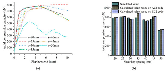 As shown in Figure 17b, the calculation of different shear key distances based on the ACI code and EC2 code was carried out and compared with the simulated values. The calculated values based on the ACI code were all less than those based on the EC2 code, 0.7% less on average. The simulated values were all less than the calculated values of the ACI code and EC2 code, 1.8% and 2.5% less on average, respectively. The overall simulated values and calculated values showed relatively stable characteristics, which verifies the applicability of the simulation results and calculated results for the axial compression capacity of the sleeve grouting connection with different shear key distances.