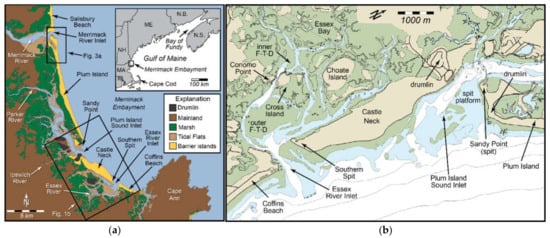 Study site: (a) physical setting of the barrier-island systems of the Merrimack Embayment (northern Massachusetts), western Gulf of Maine. Modified from []; (b) NOAA coastal chart 13274 (2011) of southern Plum Island and Castle Neck and associated tidal inlets. Many of the islands within the marsh are composed of one or several amalgamated drumlins. Plum Island Sound (PIS) and Essex River Inlets are anchored by drumlins and bedrock outcrops. Essex Bay contains an inner and outer flood-tidal delta.