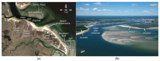 Morphological components of the Plum Island Sound Inlet sand-bypassing system. (a) Landsat satellite image from 14 April 2017. (b) Oblique aerial photo looking west into Plum Island Sound Inlet.