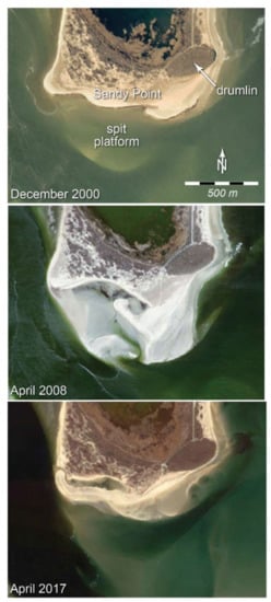 Construction of the beach protuberance and overall morphology of Castle Neck is a product of repetitive attachment of swash bars to the beach occurring over a period of more than 15 years (Figure 9). During the initial accretionary phase, when the swash bars are located some distance offshore (400–500 m), shoaling and refraction of waves around the bars creates a sheltered area along the onshore beach. Reduction in the longshore transport rate in this low-energy zone causes sand deposition and beach progradation. Thus, the beach protuberance is a product of landward migrating swash bars and the “tombolo effect”, as described in []. At its maximum, the accretionary landform extended 1.0 km along the shore, 0.4 km offshore, and had a thickness of ~1.5 m, thus containing an estimated volume of ~300,000 m3. We consider this a minimum estimate because it does not account for additional nearby swash bars. It is noteworthy that this section of Castle Neck has exhibited significant erosional and accretionary periods (Figure 9).
