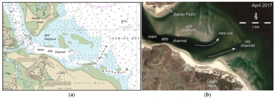 Like Sandy Point, the spit platform on southern Plum Island (Figure 8) undergoes periods of expansion and contraction over similar decadal time scales. This too is related to the influx of sand from the littoral system and to cycles of southerly migration and ebb-delta breaching of the main-ebb channel. Southerly extension of the spit platform displaces the main-ebb channel of the PIS Inlet, extending this channel to the southeast, along the shoreface of Castle Neck. This in turn slows tidal exchange between PIS and the coastal ocean and decreases hydraulic connectivity. Eventually, tidal flow cuts a new, straighter, and more hydraulically efficient course through the ebb-tidal delta via a form of inlet-sediment bypassing known as “ebb-delta breaching” [,,]. This process can be gradual or initiated during a major storm and has been described in detail for the Merrimack River Inlet by [,]. At PIS Inlet, a 1969 coastal chart and 2017 vertical aerial imagery show different stages of breaching through the ebb-tidal delta (Figure 8). Once the new, more northerly channel is established, the former southern channel is abandoned and the sand shoal that was once updrift of the main-ebb channel is now downdrift of the channel. Because this sand shoal is no longer being pushed offshore by ebb-tidal currents, wave-generated and flood-tidal currents transport the sand comprising shoal onshore in the form of landward migrating swash bars.