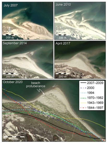 Sequential photographs showing development of the beach protuberance. Changes in morphology of the form is a function of where the swash have migrated onshore and attached to the beach. Bottom panel shows long-term shoreline changes. Shoreline data are from []. The 2007 imagery is from the USDA Farm Service Agency, and the 2010, 2014, 2017, and 2020 imagery is from Landsat.